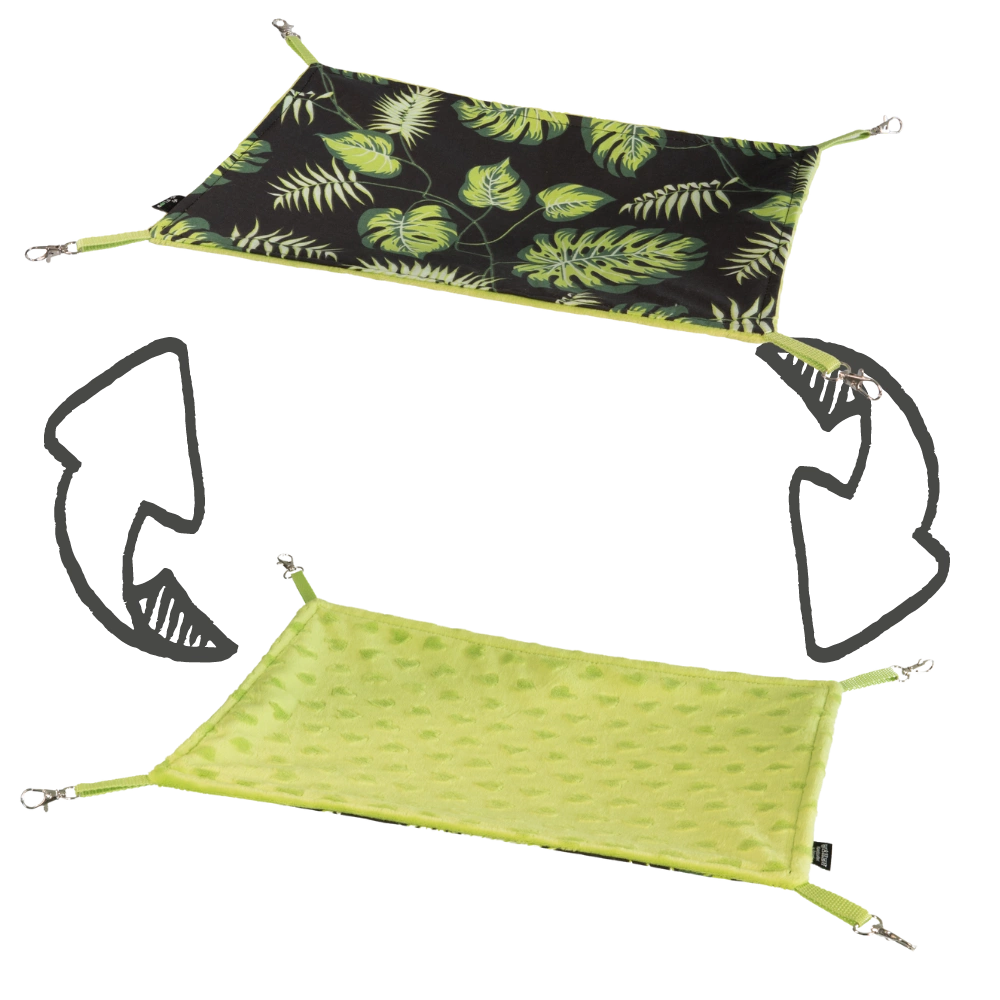 Mit unserer Kollektion aus schwarzer Baumwolle mit trendigen grünen Palmenblättern und Monsterblättern, kombiniert mit lindgrünem Minky-Vlies, können Sie einen Ersatz für einen tropischen Dschungel in Ihrem Käfig schaffen.